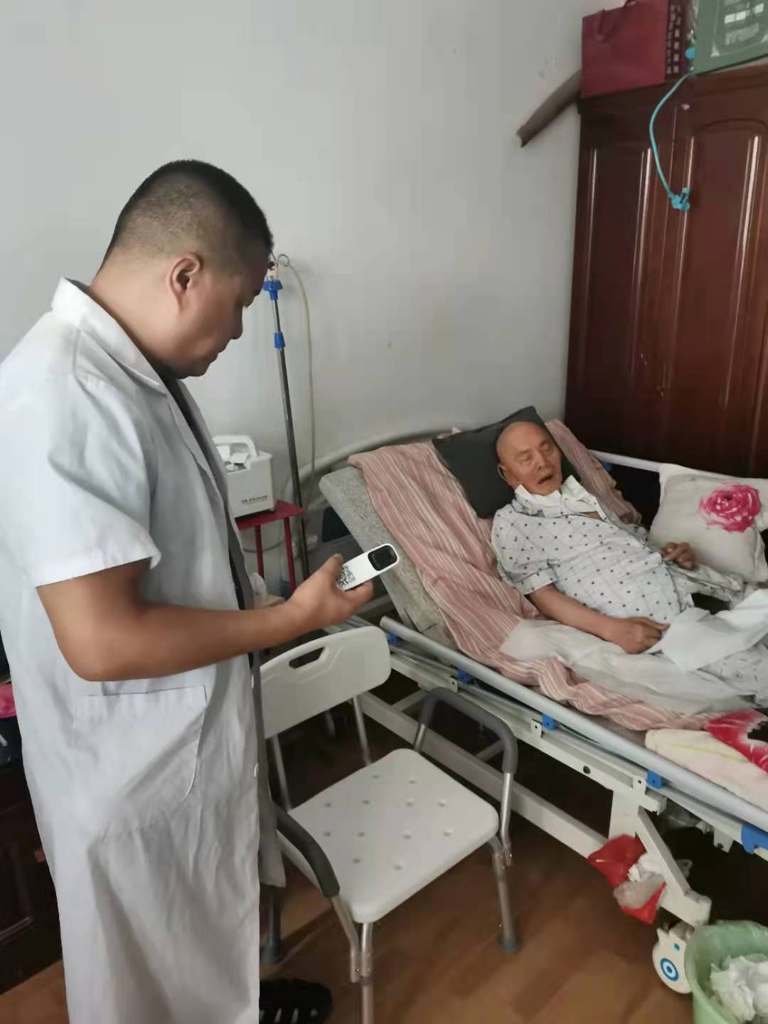 工作人员为残疾人王培刚适配防滑沐浴椅