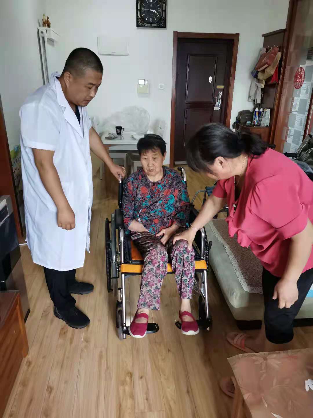 工作人员为残疾人徐明华适配轮椅