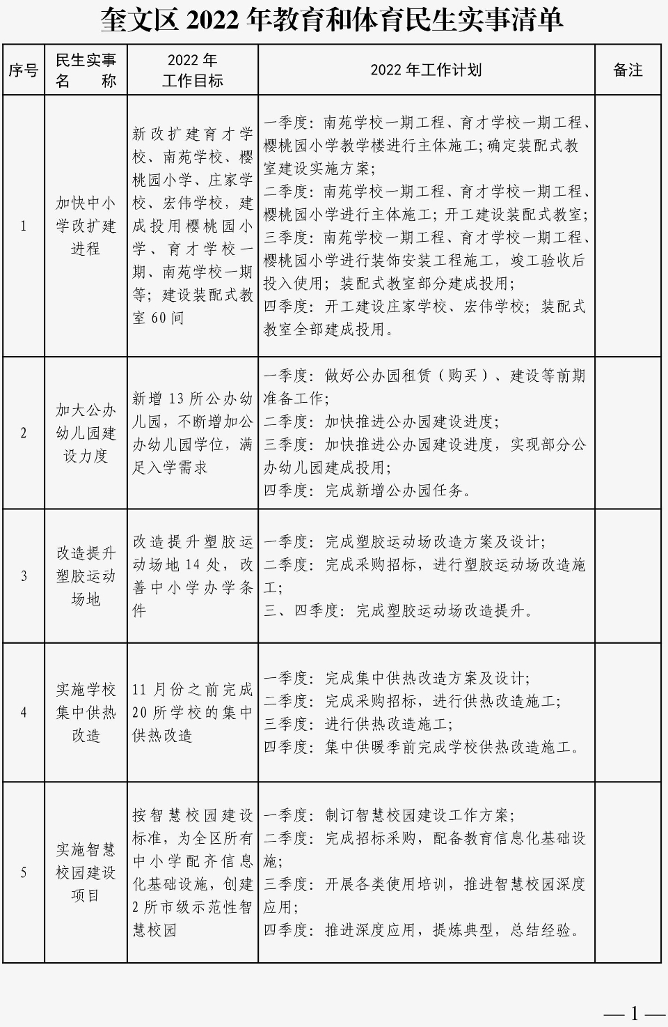 今年,奎文区委、区政府提出了“一二三四”的奋斗目标,开启了建设“更好的奎文”新阶段。在区 第十五次党代会报告和2022年区《政府工作报告》中,明确提出要牢固树立理念,加快发展优质教育、建 设教育强区,全力办好“人民满意的教育、全市最好的教育”,打造外地人为之向往、本地人为之自豪的 “学在奎文”品牌。教育和体育工作与老百姓的生活息息相关,尤其是教育,关系到千家万户的事业,是 涉及面最广、影响最大的“民生”。全区56件民生实事中,中小学改扩建、公办幼儿园建设、塑胶运动场 地改造、学校集中供热、智慧校园建设、优秀师资引进、中小学午休延时服务、教学设施配备、更新健身 器材、校园食堂食品安全监测等10件教育和体育实事列入其中。