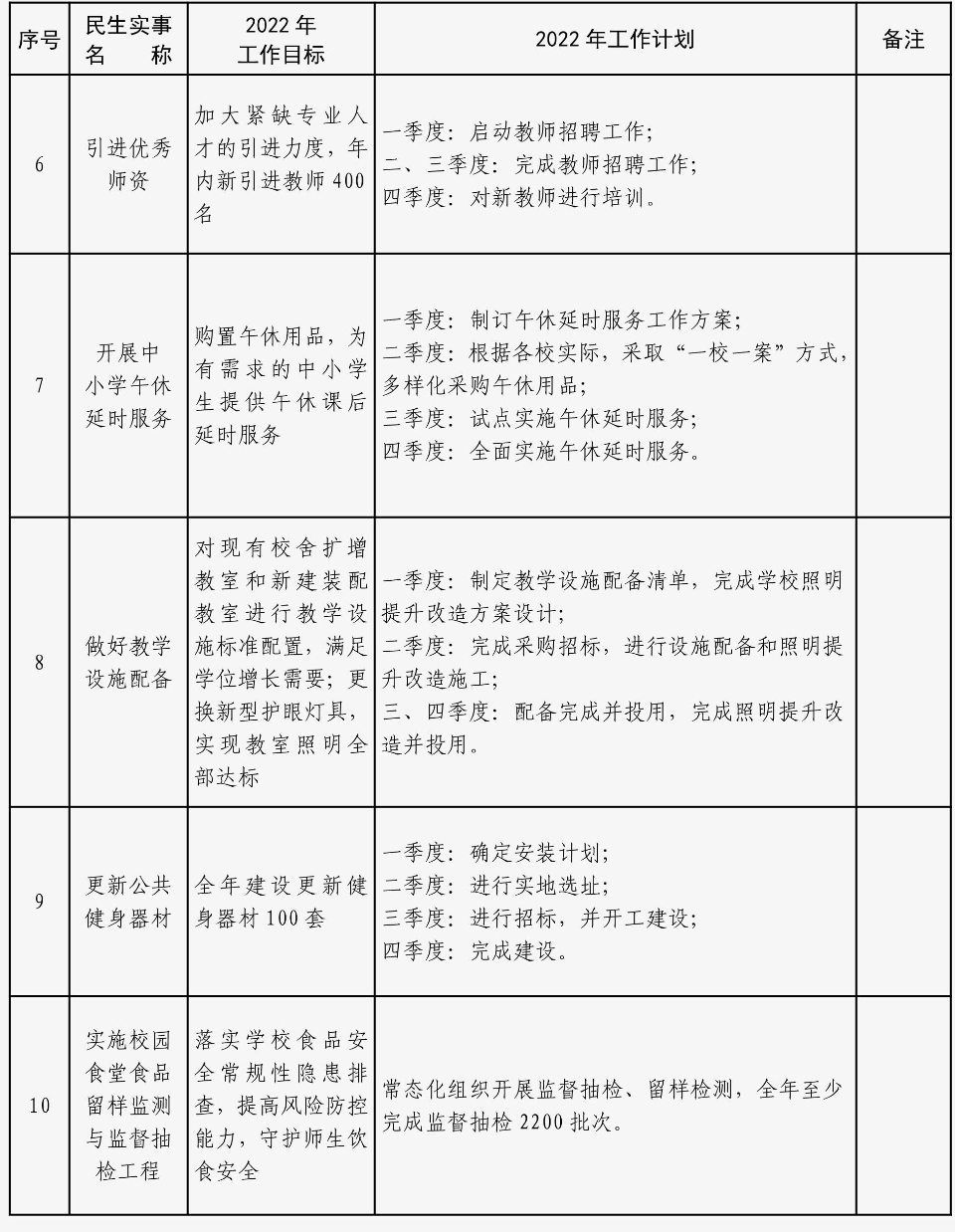 新增中小学学位4000个、增加公办学位2000个、增加13所公办幼儿园,引进教师400名……2月6日, 奎文区教体系统2022年工作会议召开,奎文区2022年十件教育和体育民生实事清单出炉,中小学改扩建、 公办幼儿园建设、塑胶运动场地改造、学校集中供热、智慧校园建设、优秀师资引进、中小学午休延时服 务、教学设施配备、更新健身器材、校园食堂食品安全监测等10件实事出炉。