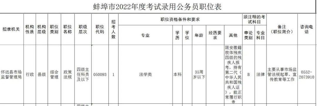 2月22日,安徽蚌埠先锋网发布了《蚌埠市2022年度考试录用公务员职位表》,其中怀远县市场监督管理局一个职位要求“限安徽籍肢体残疾四级的残疾人报考”,引发网友关注和热议。