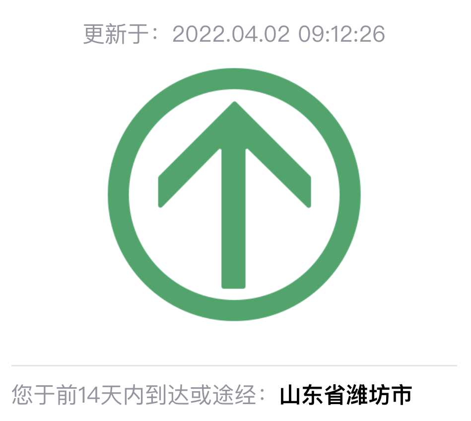 齐鲁晚报·齐鲁壹点记者 马媛媛 4月2日上午,潍坊市民的行程卡,已经没有“*”标记。 4月1日晚,潍坊市委统筹疫情防控和经济运行工作领导小组(指挥部)办公室发布通告称,自4月2日0时起,潍城区城关街道颐园小区、北关街道谷德锦商场由中风险地区降为低风险地区。解除潍城区封控区(城关街道颐园小区、北关街道万家福超市)和管控区(北到玄武街、西到长松路、南到胜利街、东到白浪河的区域)封控管控措施。 记者了解到,2022年3月13日14时起,潍城区城关街道颐园小区划为中风险区,潍坊市其他区域风险等级不变。