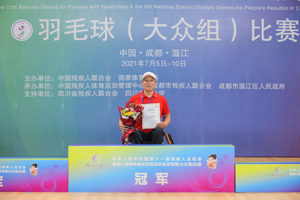 2021年,我被选中代表山东省参加全国残疾人轮椅羽毛球(大众组)的全运会比赛。随着最后一场比赛的结束,自己终于实现了为之奋斗的目标全国冠军。这个冠军得来不易,是汗水和刻骨训练的结果。开始练习羽毛球,每天都要在轮椅上进行五六个小时的轮椅移动训练和体能训练。一天下来,手上磨起一个又一个血泡,胳膊也被球拍打得青一块、紫一块。那条残腿在一天天的训练后,更是疼痛难忍,苦不堪言。而每天几百次上千次地重复单调的动作,几乎让我发疯!这一切我都用顽强的意志咬牙挺了过来,我要用球拍,为自己的人生划出一道优美的弧线。