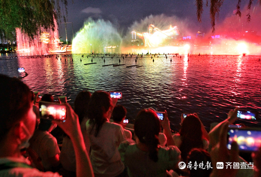 28日晚8点,湖中荷浪迷人、画舫穿行,岸边火树银花、杨柳荫浓,大秀开始,声光绽放、精彩纷呈,济南的夜空瞬间被点亮。