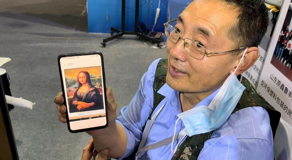 7月29日展能节现场,他在展区画的是《蒙娜丽莎》。他告诉记者,他画这幅画的数量早已有两三千幅了,并在镜头前展示出自己因长时间作画而形成厚厚老茧的双手。看着面前栩栩如生的画卷,人们不禁感叹其背后所付出的艰辛努力和对画画的痴迷。