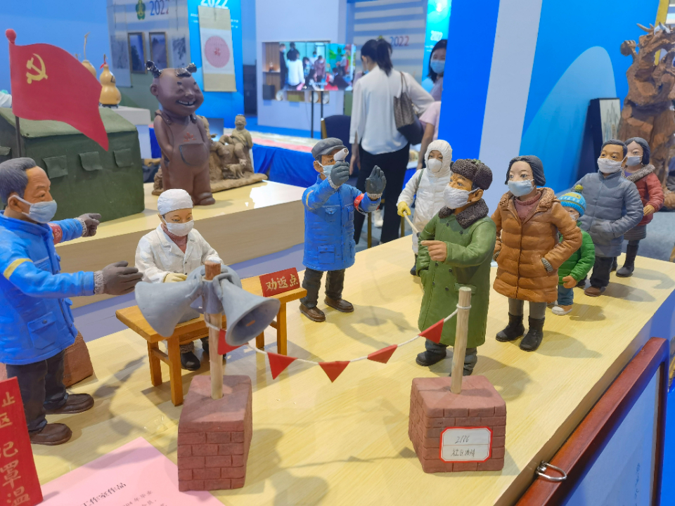 临沂展区的从兰桂先生是山东省临沂市沂南县人,他16岁因骨肿瘤左腿截肢,21岁开始在城市街头用粉笔作画。见他拿起一支彩铅,在面前的画作上执笔作画,神态十分认真。