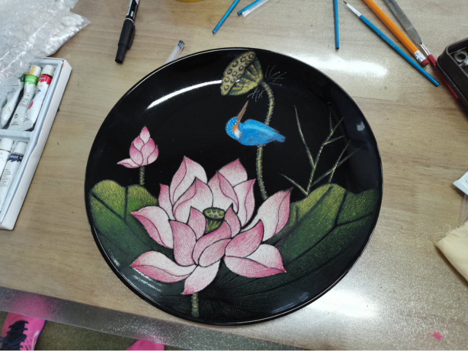 来自山东省临沂市的刘从波凭借所刻的荷花图斩获了此次刻瓷项目的第二名,其所刻荷花色彩艳丽、栩栩如生,极富有动态美,一只驻足在莲蓬上的鸟儿更是为作品增添了一丝趣味,令人叹为观止。据刘从波介绍,本次作品的灵感来自于济南大明湖中伏时盛开的的荷花,从构思、绘画到刻瓷、上色,总共耗费5小时。刘从波在比赛结束后十分兴奋,他告诉记者自己克服了比赛过程中出现的一些困难,对自己的作品很有信心。同时,刘从波透露自己明年将在淄博市进行刻瓷训练,为全国的残疾人技能大赛做准备。