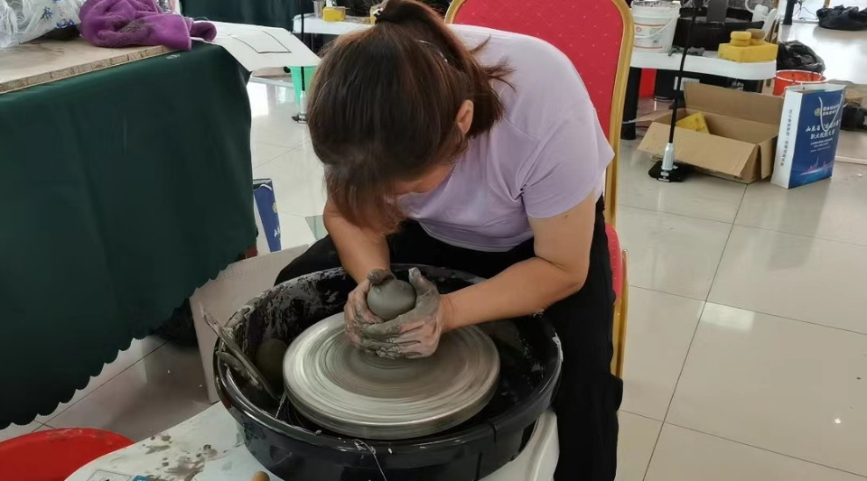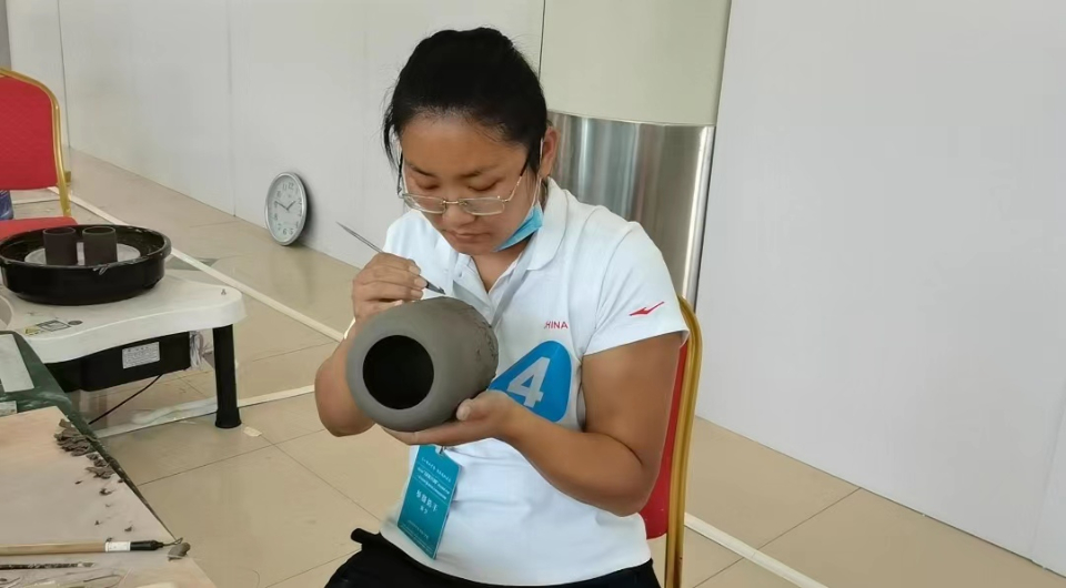 来自山东省济宁市的孙文芝是此次陶艺项目的参赛选手。孙文芝介绍:“自由创作是在固定器型上以农业为主题进行创作,本来我想做一个场景类的浮雕,但由于时间有些紧张,就做了一个夏季盛开的荷花主题雕刻。”同时她表示这是自己第一次参加竞赛,对规则不够了解,并且由于自身所带工具不够齐全和时间安排不够合理,增加了此次制作的难度。