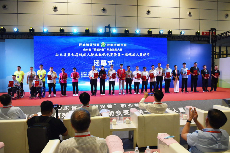 闭幕式宣布了此次竞赛成绩和获奖集体、个人名单,济南代表队获团体一等奖,烟台等8个代表队获优秀组织奖,枣庄等5个代表队获道德风尚奖,山东劳动职业技术学院等8个单位获突出贡献奖,山东省互联网传媒集团股份有限公司等11个单位被评为助残先进单位,商和福等48名同志被评为优秀裁判员,济南市葫芦雕刻项目马桂琴等20个展能项目被评为优秀展能项目。