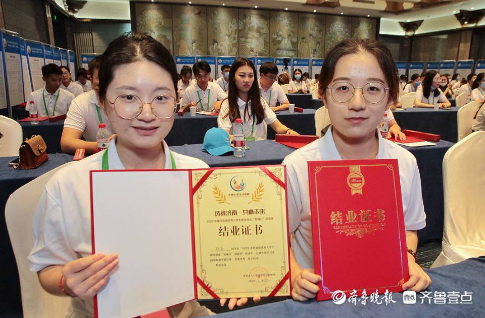 济南市人社局党组成员、市公共就业服务中心主任王振群,济南市人社局就业促进与失业保险处处长刘文军,齐鲁晚报·齐鲁壹点副总编辑王健为营员代表发放了结业证书和纪念品。