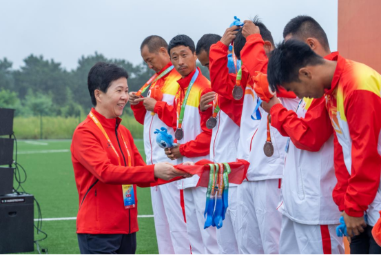 8月29日上午,山东省第十一届残疾人运动会聋人足球比赛颁奖仪式在日照国家海滨森林公园足球训练基地举行,山东省残联副理事长张文涛、日照市委副书记王新生、日照市副市长林彦芹出席并为获奖运动员颁发奖牌和奖杯。