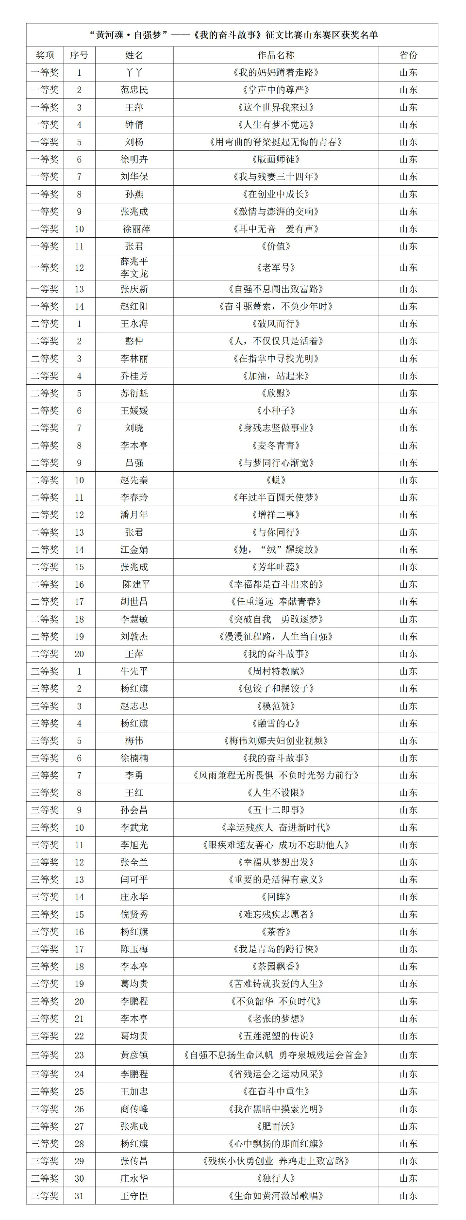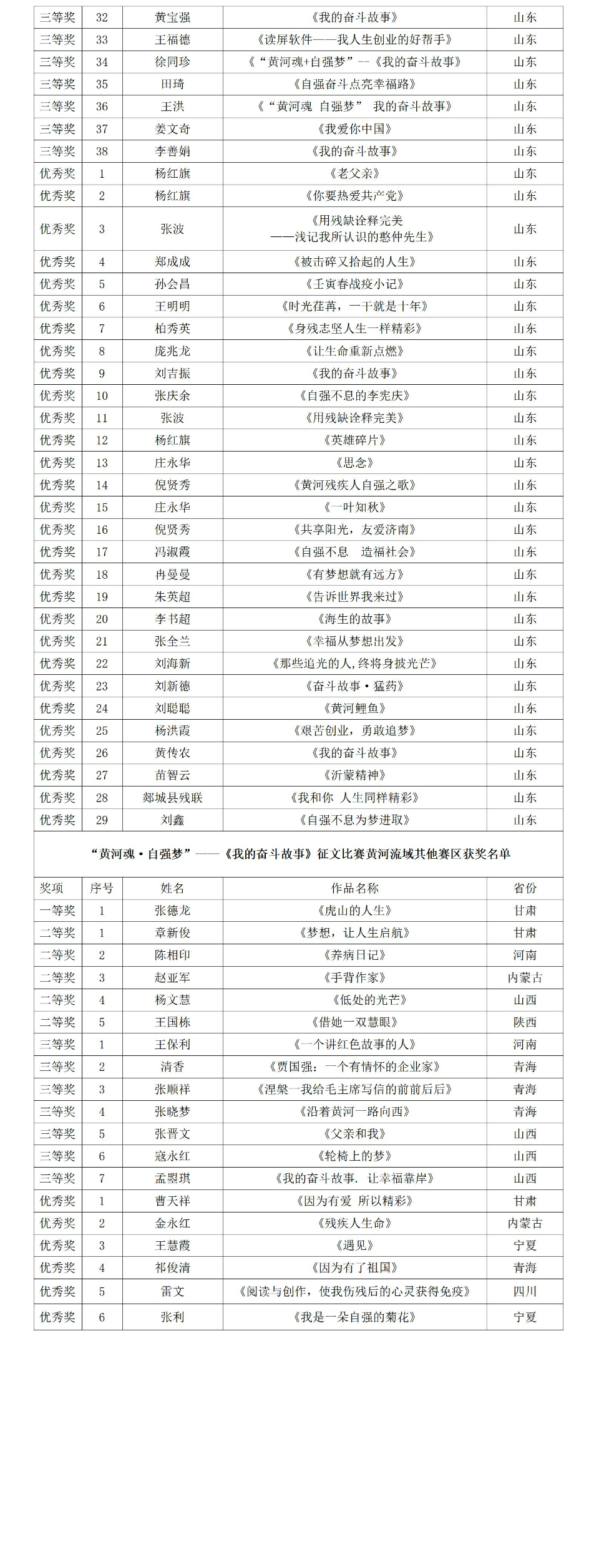 由中国残联宣传文化部指导,山东省残联、齐鲁晚报·齐鲁壹点主办,黄河流域九省(区)残联参与开展的2022年“黄河魂·自强梦”《我的奋斗故事》主题征文比赛,在各方共同努力下取得圆满成功,120个优秀作品获奖。