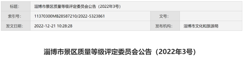 近日,淄博市文化和旅游局公布了一则《淄博市景区质量等级评定委员会公告》,公告显示:根据中华人民共和国国家标准《旅游景区质量等级的划分与评定》和《山东省旅游景区质量等级管理办法》规定,经有关区县、功能区文旅部门推荐,淄博市景区质量等级评定委员会按程序组织综合评定,并经公示无异议,确定淄川区梓橦山景区、博山区颜神古镇、桓台县泓基庄园、高青县陈庄—唐口西周遗址博物馆、沂源县朱家户乡村旅游休闲区、文昌湖省级旅游度假区多米渔乐岛等6家旅游景区为国家AAA级旅游景区。