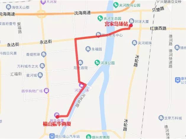 由宫家岛场站发车,沿宫家岛路、红旗西路、永达街、松霞路、崇文街、河滨路、城里街运行至福山振华商厦。