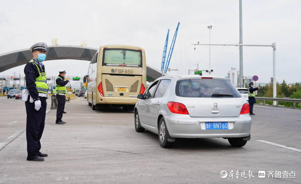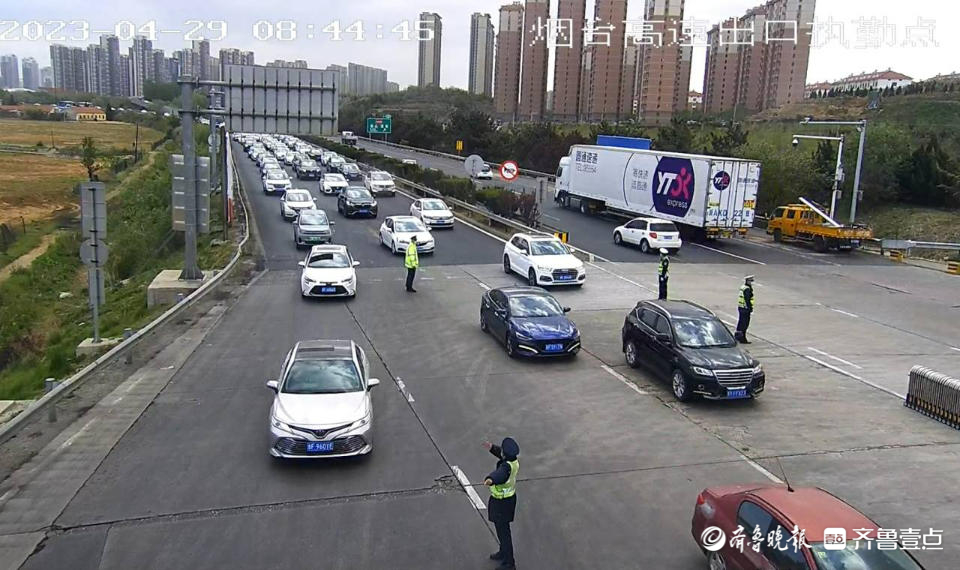 福山收费站,是进出烟台的“西大门”。4月29日,“五一”小长假第一天,烟台福山收费站共计出入车辆12万辆次,是2019年“五一”小长假首日车流量的2.5倍。当天上午,齐鲁晚报·齐鲁壹点记者来到福山收费站,源源不断的车流一眼望不到头,收费站入口处的每一条车道上,都有一名烟台高速交警支队福山大队的民警负责指挥疏导车流。