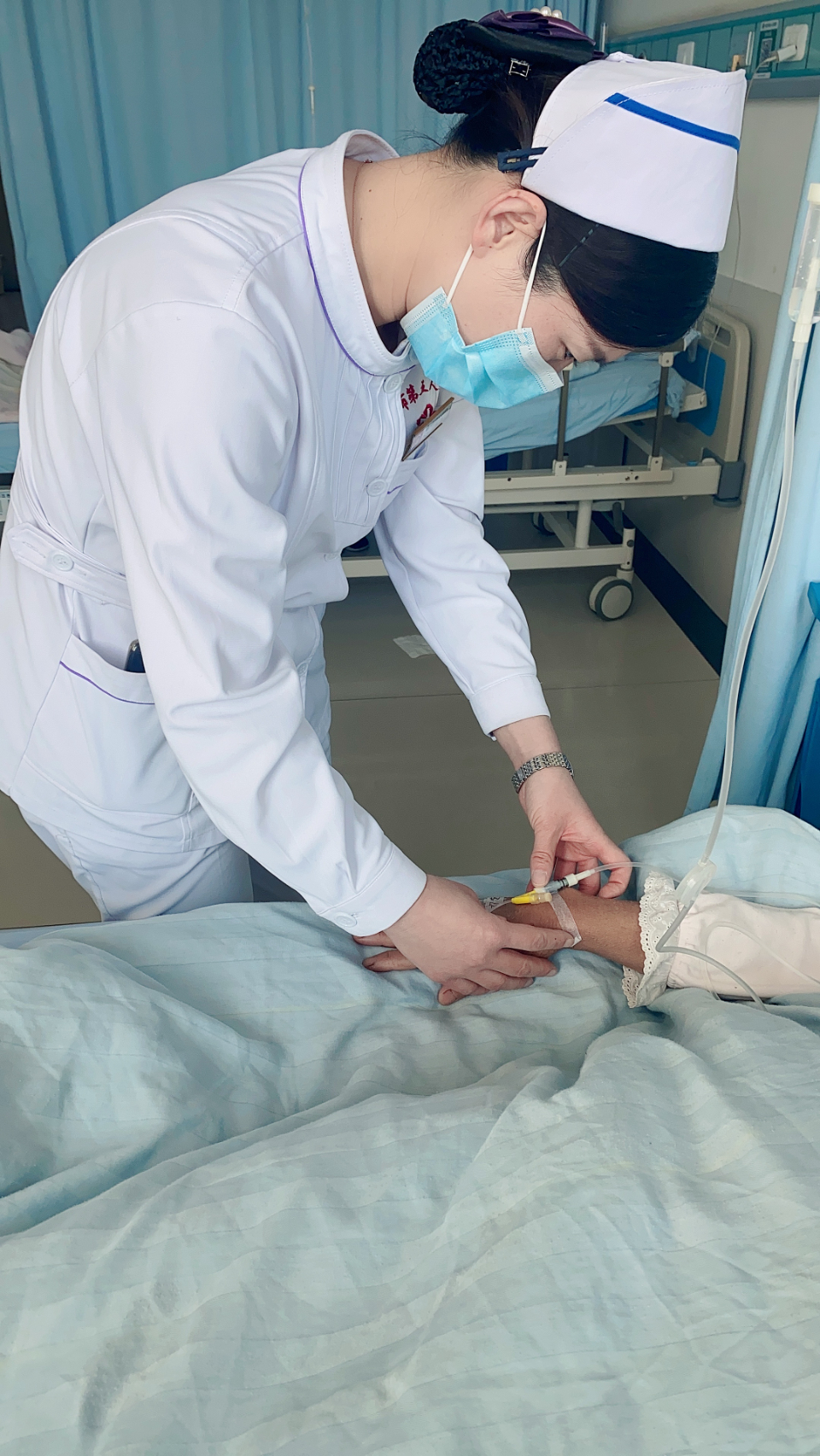 有一次,科室有位老大爷因为难受情绪极不稳定,表现非常不配合,在给大爷做基础护理时,大爷一脚踢到了她的眼眶上,她的眼睛顿时出现了一道血印,她没有埋怨,更没有放弃,拿起纱布擦擦眼角,从容的坚持给大爷做完护理,反而安慰同事说:“不怪大爷,他肯定不是故意的,就当是一种特殊的打招呼的方式吧!”。就是这样的仁爱之心,感动了患者,也感动了身边的同事。
