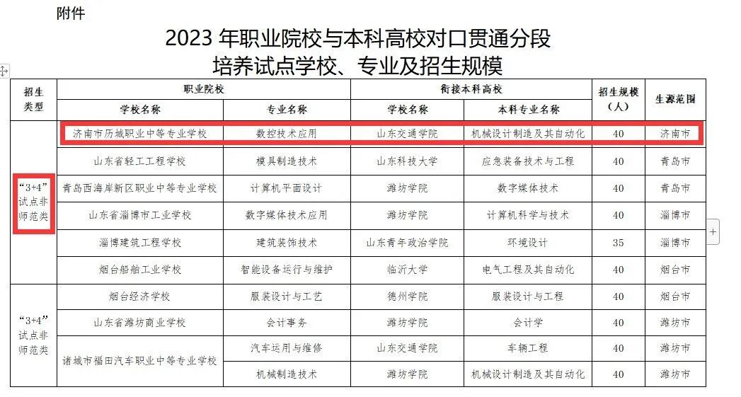 经山东省教育厅批准,济南市历城职业中等专业学校(以下简称为“历城职专”)自2014年起与山东交通学院进行“3+4”对口贯通分段培养工作试点,中职专业名称是数控技术应用(代码080203),对口本科专业为机械设计制造及其自动化(代码051400),提前批录取专业,不影响第一志愿填报,历城职专是济南市唯一一所“3+4”中本对口贯通培养学校。