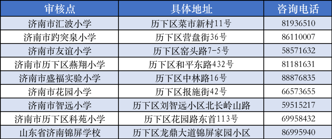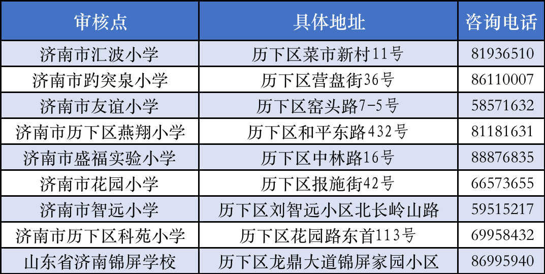 历下区共设立了9个确认网点。家长可以在7月11至12日登录“历下区义务教育入学服务平台”网上预约时间和审核网点,或通过咨询电话提前预约。未预约成功的,请在规定时间选择就近的网点受理。审核网点与录取学校无关。