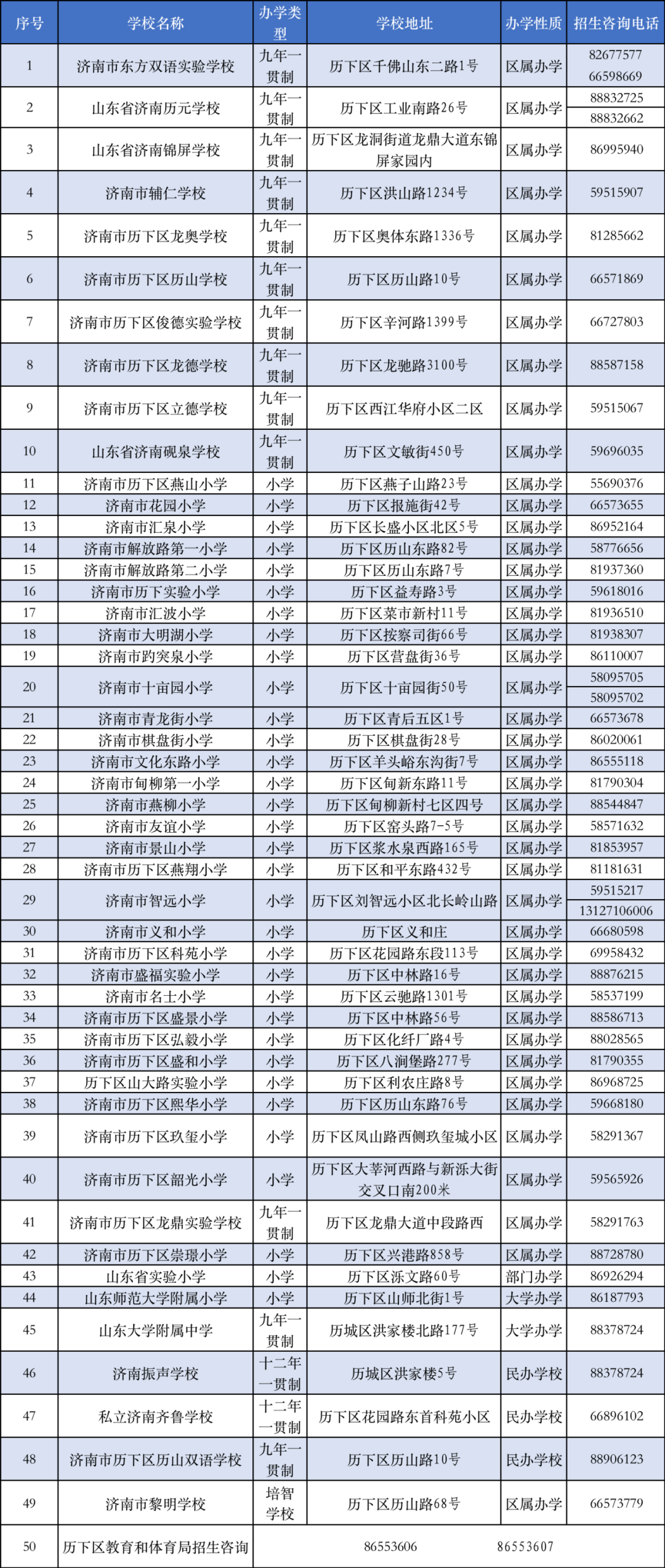 四十六、历下区各小学阶段招生学校咨询电话