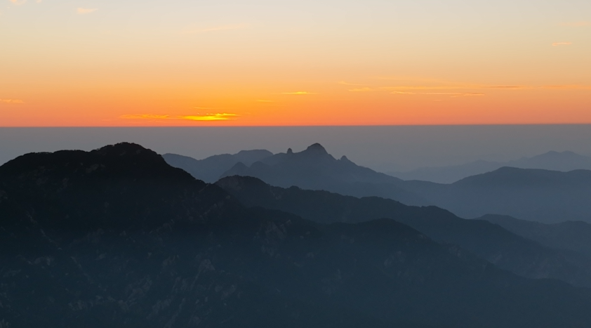 立于蒙山之巅,极目远眺,周围群峰匍匐在地,河流村舍点缀其间。连绵不绝的山脉,颜色由深渐浅,好似一副水墨丹青。仰卧于此的伟人峰,云遮雾绕的笔架峰,都正期待你挥动长豪,书写新的传奇。