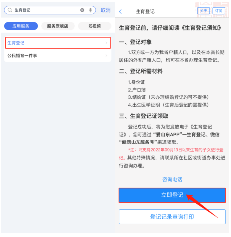 1、打开“爱山东”APP、支付宝小程序,首页搜索“生育登记”进入服务;