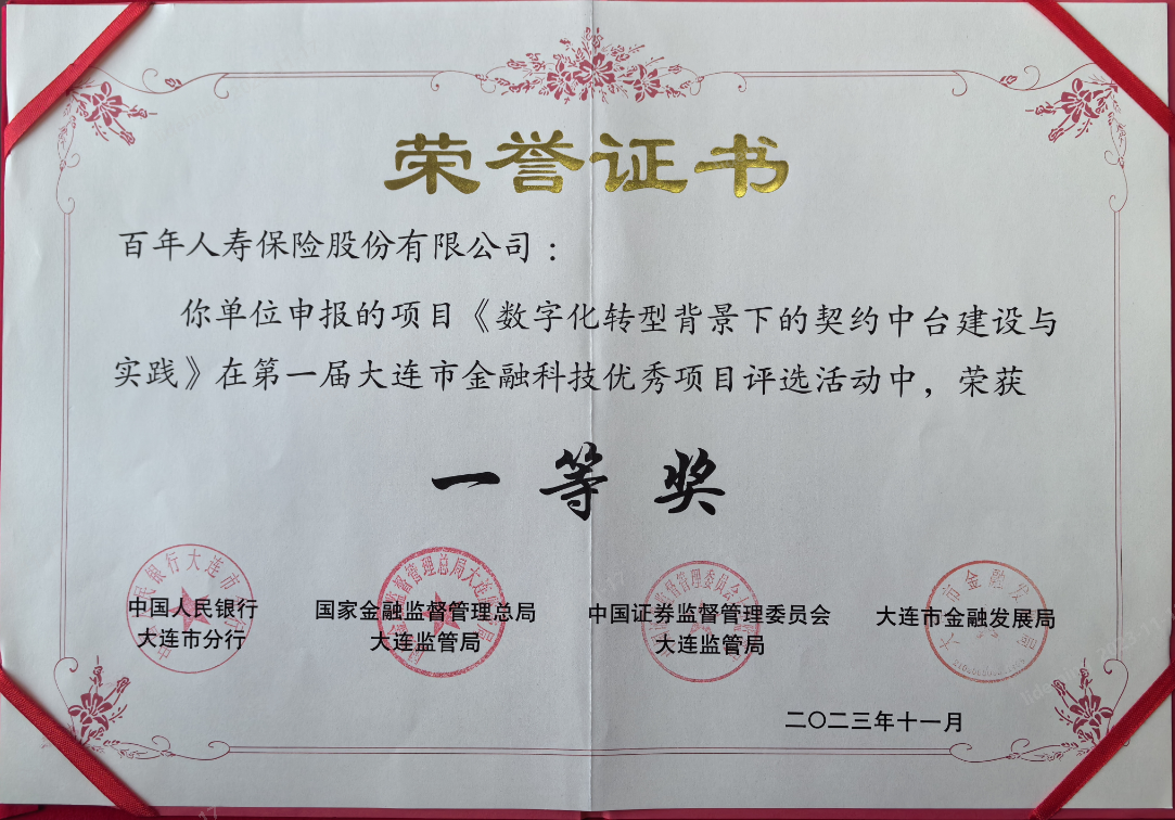 11月16日,由中国人民银行大连市分行、国家金融监督管理总局大连监管局、中国证券监督管理委员会大连监管局、大连市地方金融监督管理局主办的“2023年大连市金融科技发展工作会暨第一届大连市金融科技优秀项目评选”奖项隆重发布。经过申报筛选、资格审查、工作组专家初审、项目路演复审多个阶段综合评判,百年人寿在众多参选公司中脱颖而出,获得第一届大连市金融科技优秀项目一等奖。