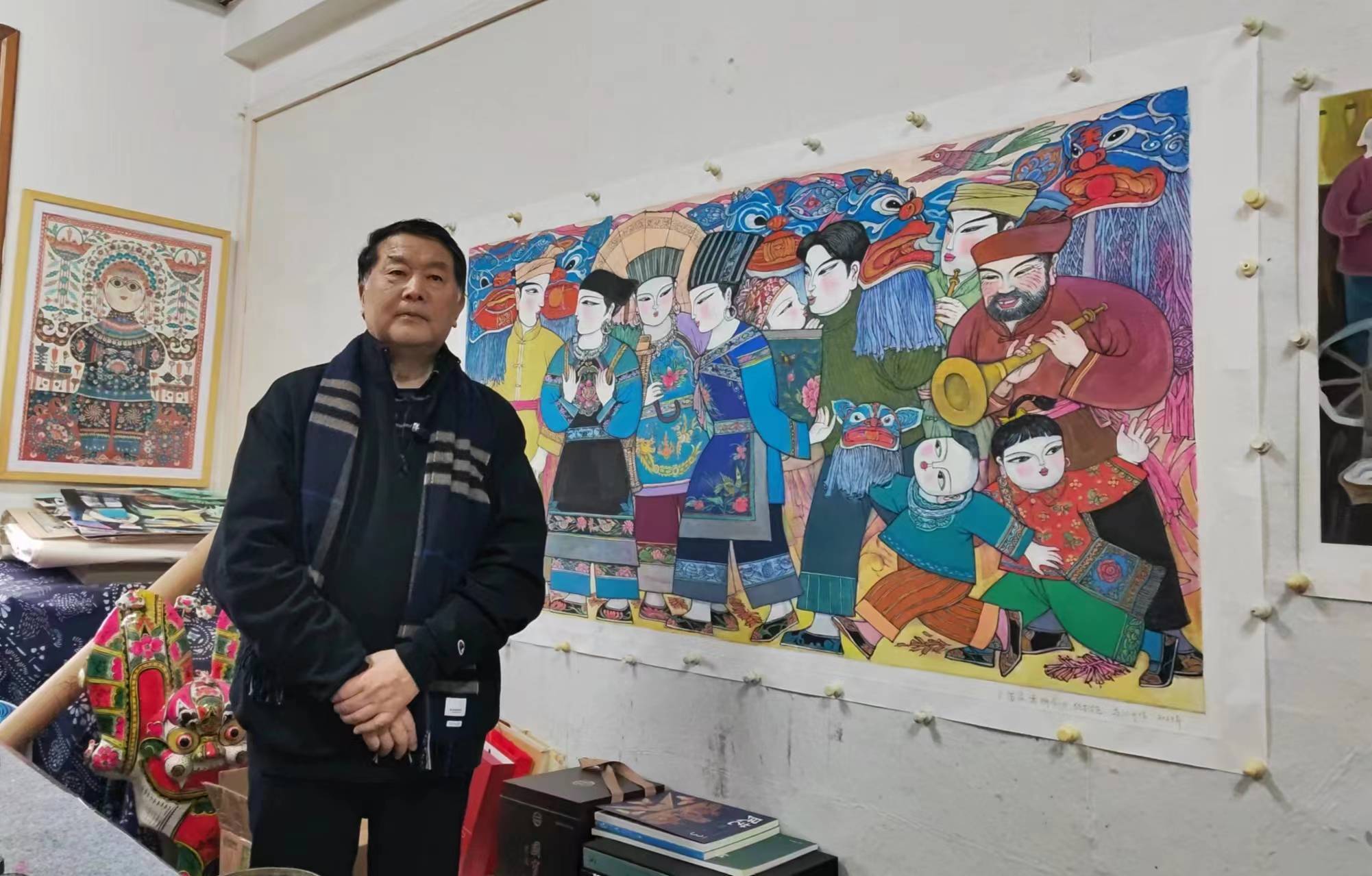 所以将来年画这个品种,它会是永恒的一个艺术项目,它不会消失。我现在还在画年画,今年墙上这个就是我画的。对于我们这个年龄来说,它是一个既亲切又遥远的东西。