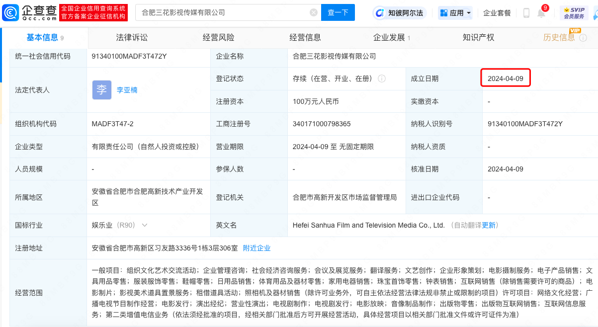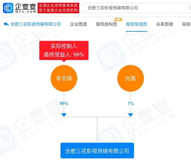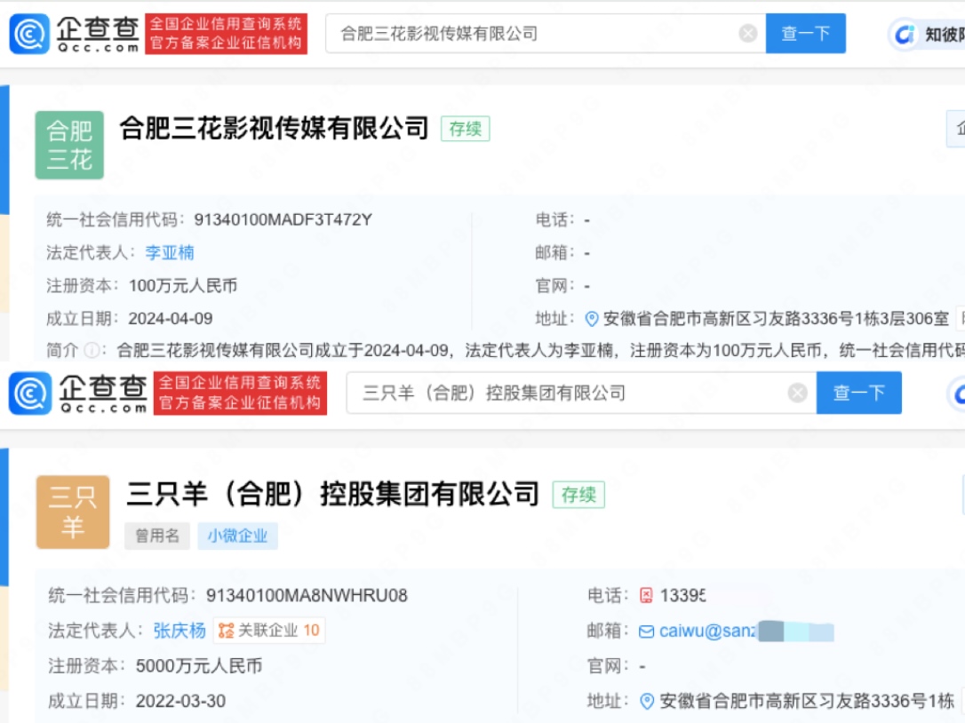 据企查查APP显示,该公司成立于今年4月9日,注册资本100万人民币,法定代表人为李亚楠,经营范围含文艺创作、电影摄制服务、电视剧制作等。股东信息显示,该公司由李亚楠、张磊分别持股99%、1%。值得一提的是,该公司注册地址与三只羊(合肥)控股集团有限公司为同一栋楼。
