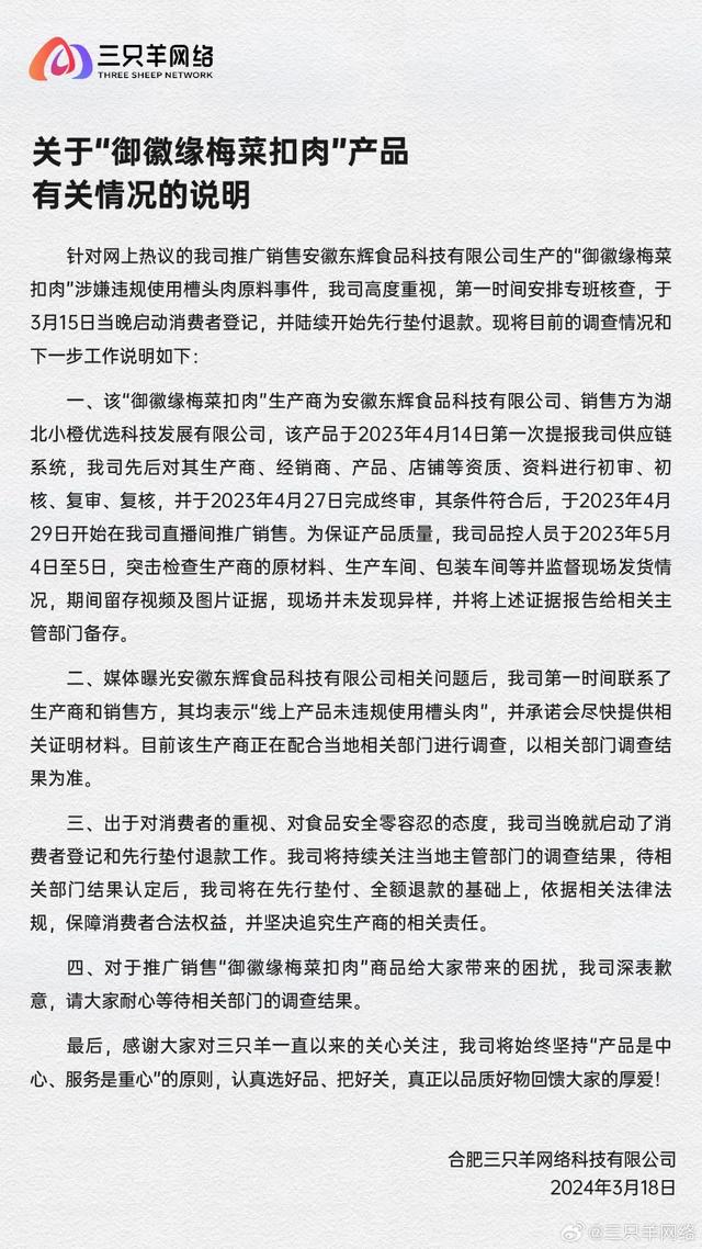 此前,“王海打假小杨哥槽头肉”事件在网上持续发酵,3月18日,@三只羊网络官方微博发表声明并道歉。3月20日,小杨哥也在直播时回应道:“公司回应了,不可能逃避,肯定给大家一个满意的结果。之前已经讲过了,老讲别人不就烦了嘛”“我现在是企业化了,公司账号有(回应)了,大家可以去看看。”