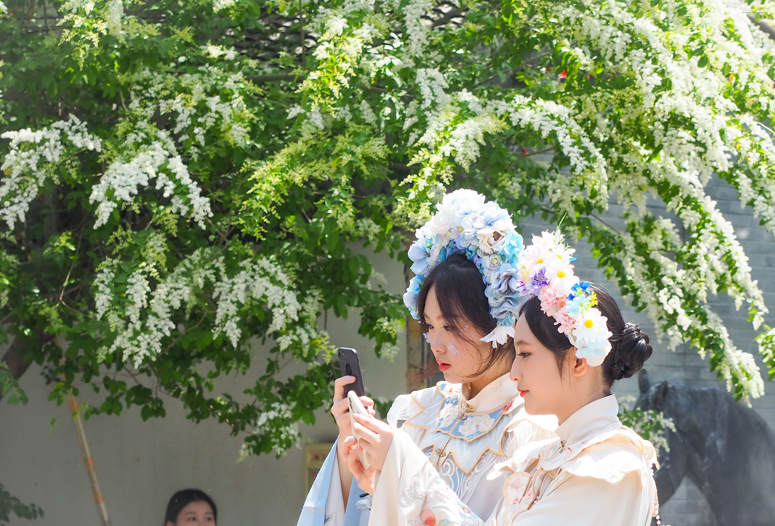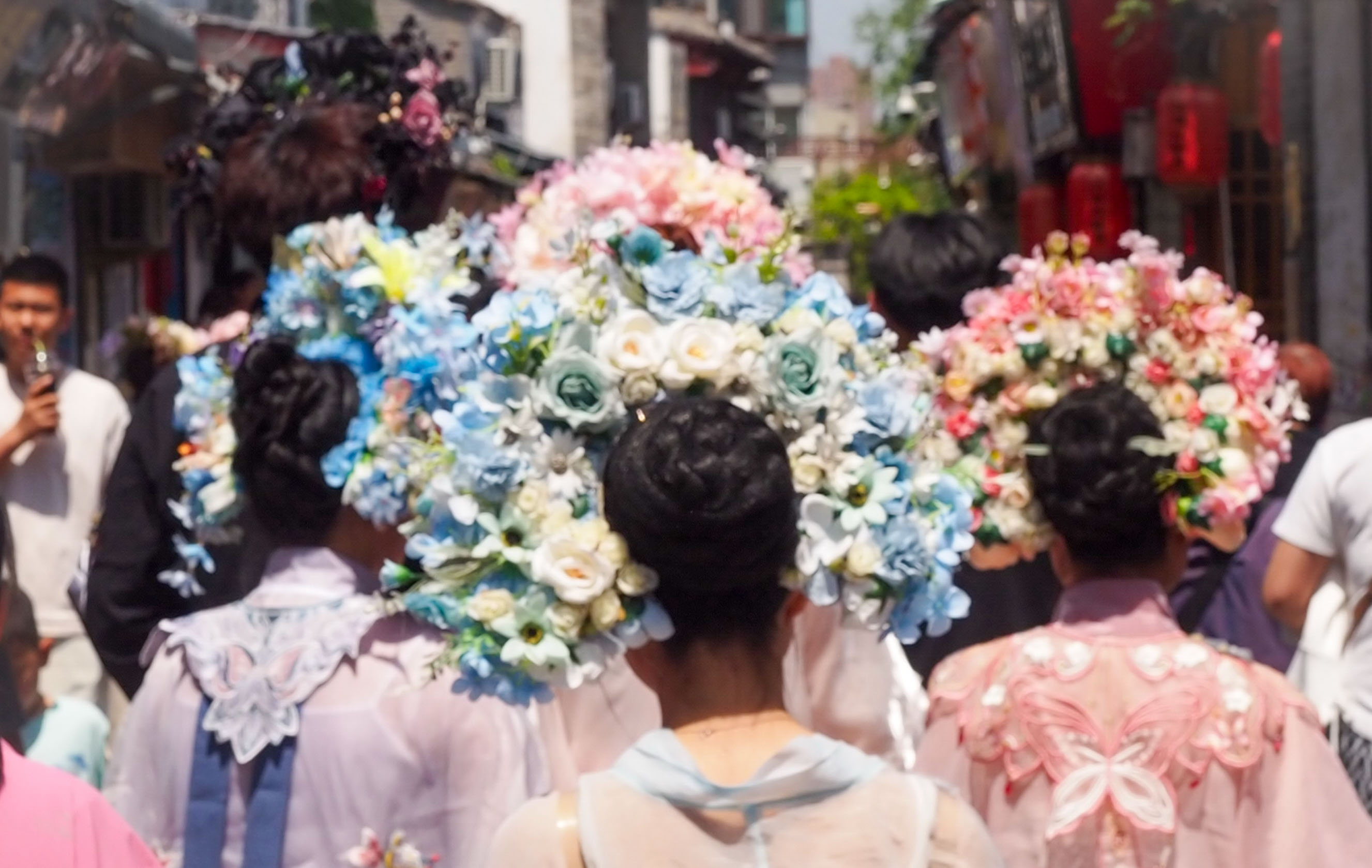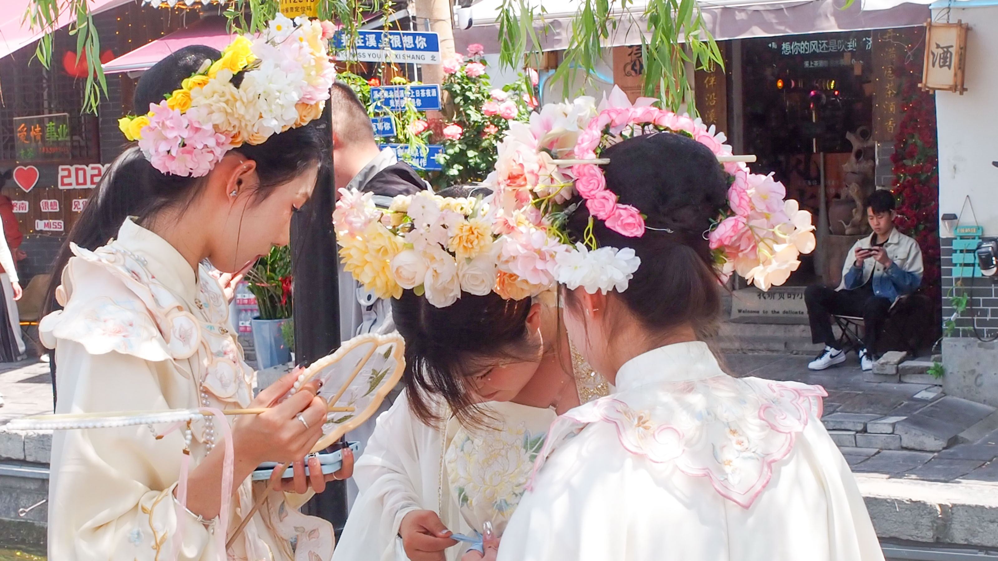 周青先 济南报道 五一假日,济南明府城老街区最亮眼的风景,除了小桥流水、百年古宅,就是满街流动的簪花潮。 簪花潮来得迅猛而靓丽,无数女孩一看到美丽的簪花和飘逸的汉服,立刻掉进这美丽的漩涡,纷纷打扮起来满街留影。济南的老街巷,顿时多了无限的青春活力。