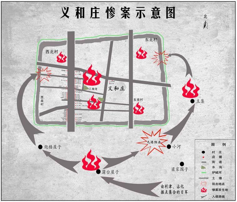 在义和庄大街小巷、土井湾旁,到处是一摊摊、一洼洼的鲜血,空气中充满了血腥味。