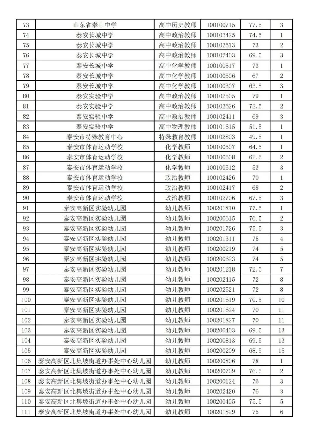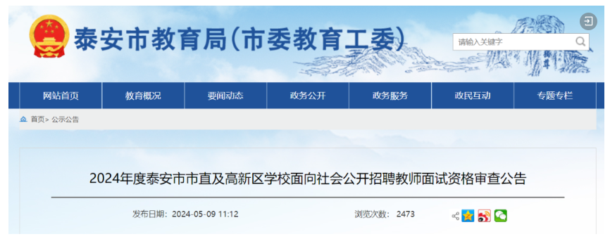 2024年度泰安市市直及高新区学校面向社会公开招聘教师笔试成绩已在泰安市教育局网站(http://jyj.taian.gov.cn/)公布,请各位考生登录查询。按照《2024年度泰安市市直及高新区学校面向社会公开招聘教师简章》规定,现将本次公开招聘面试资格审查有关事项公告如下: