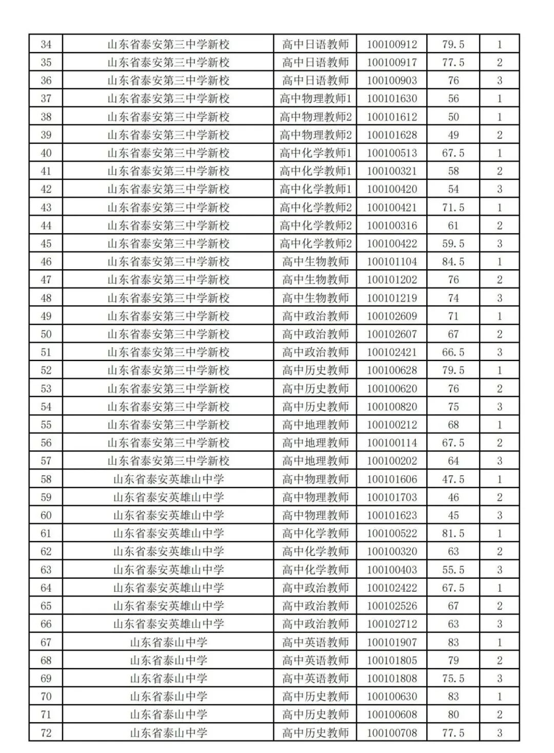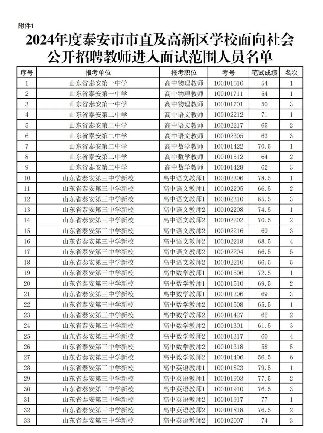 按照招聘简章规定,从达到笔试合格分数线的应聘人员中,根据招聘岗位和招聘计划由高分到低分按1:3的比例确定面试人员,达不到1:3比例的岗位按实有合格人数确定进入面试人员。2024年度泰安市市直及高新区学校面向社会公开招聘教师笔试成绩合格分数线确定为40分。进入面试范围人员名单详见附件1。