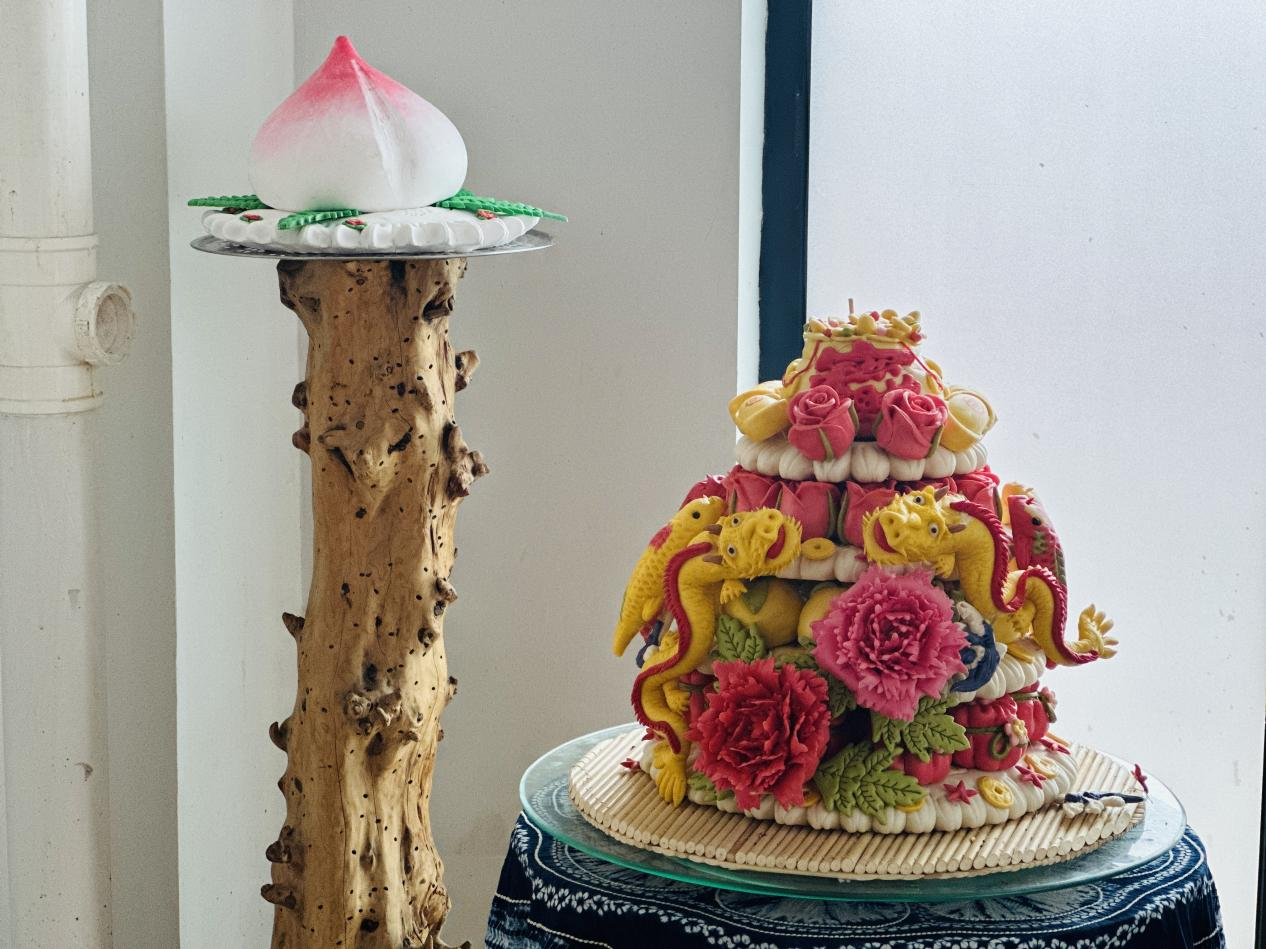 泰山花馍的选材极为讲究,精选优质精制面粉、新鲜牛奶与山鸡蛋,搭配天然食材如菠菜汁、南瓜泥、红曲米等调制色彩,全程不添加任何色素与防腐剂,确保了产品的生态、绿色、营养与美味;经过选材、和面、制作、醒发、蒸制、晾晒六道大工序及数十道小工序的精心打磨;醒狮龙、福袋、元宝、桃子等形态各异、生动逼真的花馍作品应运而生,它们不仅色彩鲜艳、造型精美,更蕴含着丰富的文化内涵与美好的寓意。这些花馍被广泛应用于老人祝寿、宝宝生日、开业庆典、结婚志喜、节日礼盒等多种场合,深受广大客户的喜爱与好评,被誉为“有故事的中式蛋糕”。