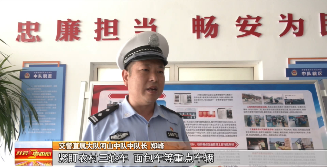 交警直属大队河山中队中队长郑峰:紧盯农村三轮车、面包车等重点车辆,从严查处违法载人、超员超载、酒醉驾等重点违法行为,同时开展交通安全宣传教育,用身边事教育身边人,提升了辖区群众的交通安全意识,中队同时持续开展交通安全隐患大排查大整治工作,确保辖区道路安全稳定,为群众创造安全、有序、畅通的道路交通环境。