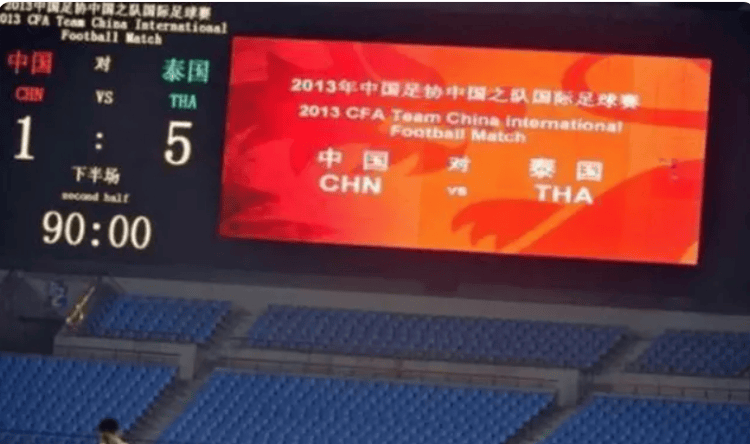 2013年6月15日的一场国足热身赛中,主场作战的中国国家队在合肥,以1-5的大比分惨败给来访的泰国国家队,为中国足球的惨败历史再添尴尬一页。