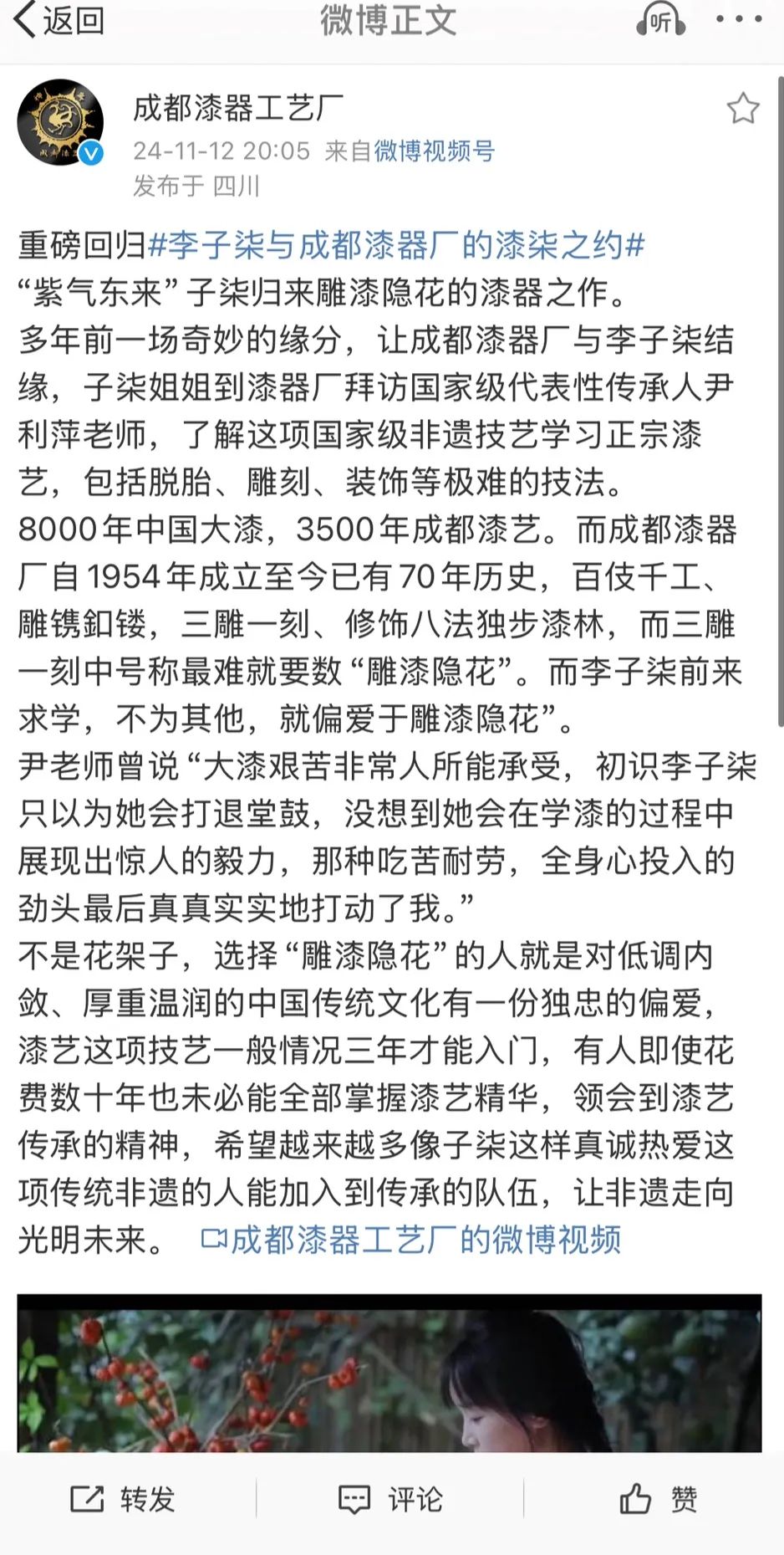 记者注意到,11月12日,成都漆器工艺厂发布微博称,多年前一场奇妙的缘分,让成都漆器厂与李子柒结缘,子柒姐姐到漆器厂拜访国家级代表性传承人尹利萍老师,了解这项国家级非遗技艺学习正宗漆艺,包括脱胎、雕刻、装饰等极难的技法。