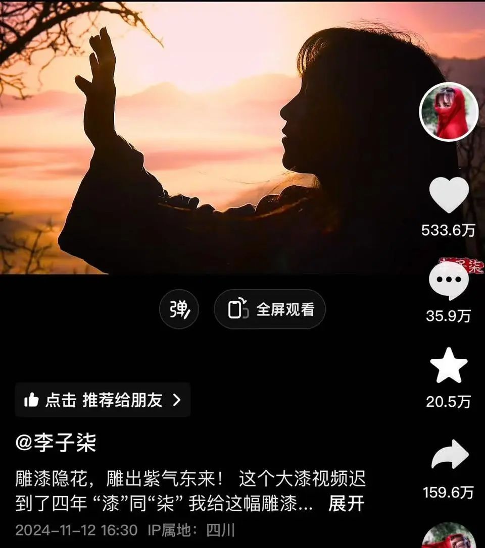 11月12日,李子柒发布微博称,“这个大漆视频迟到了四年,‘漆’同‘柒’,我给这幅雕漆隐花的漆器作品取名‘紫气东来’。麒麟回首,万事不愁。也把这份祝福送给看到视频的每一个你,很想你们。”
