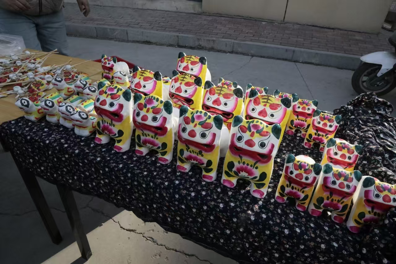 “小孩小孩你别哭,你爹去了登州府,花啦棒、泥老虎,咕嘎咕嘎两毛五……”刘氏陶艺的摊位前,第六代传承人刘娜正在向游客介绍着一款泥老虎。这种泥老虎腰部是断开后用牛皮连接的,拿着头和尾挤压后,泥老虎会发出“咕嘎咕嘎”的响声。