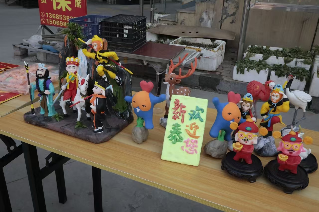 面塑摊位上,既有传统的十二生肖面塑,憨态可掬,寓意吉祥;又有紧跟潮流的“雪王”、新泰宝宝、小猪佩奇等新式形象,吸引了不少年轻人的目光。“咱们先来普及普及咱新泰面塑的文化”。非遗传承人李学全热情地招呼着围观的游客。只见他捏起一块面团,灵巧的手指在面团上跳跃翻飞,如同在编织一个关于新年的美好愿景。不一会儿,一个个栩栩如生的人物、动物便跃然眼前,引得游客们连连惊叹。