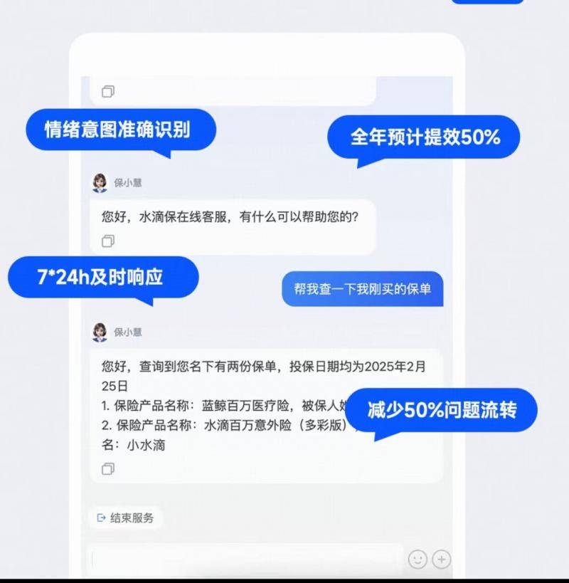 水滴保业务负责人介绍,水滴 “保小慧”将覆盖保单咨询、保单管理、产品答疑等多个保险客服服务场景。依托前沿大模型能力,“保小慧”能够精准识别用户情绪,7*24h及时响应,全年预计可减少50%问题流转率,服务提效可达50%。