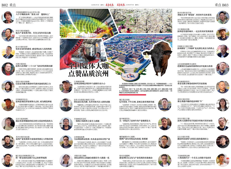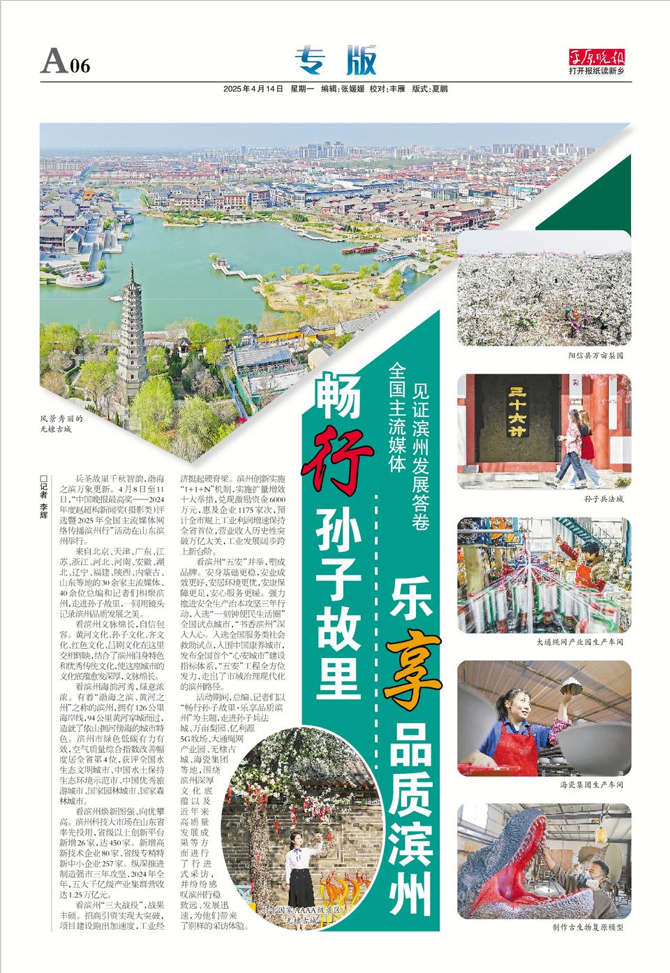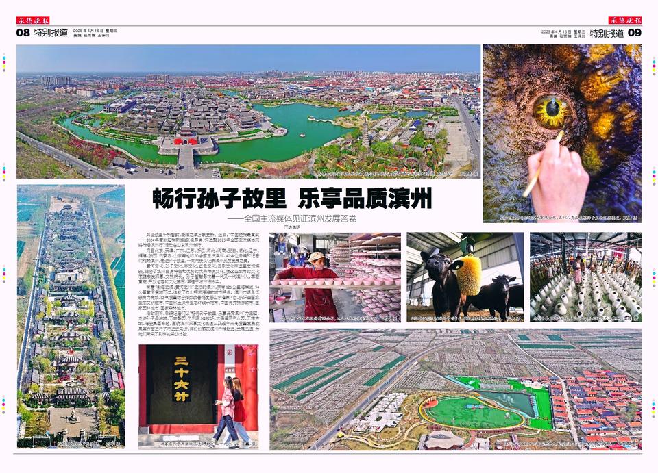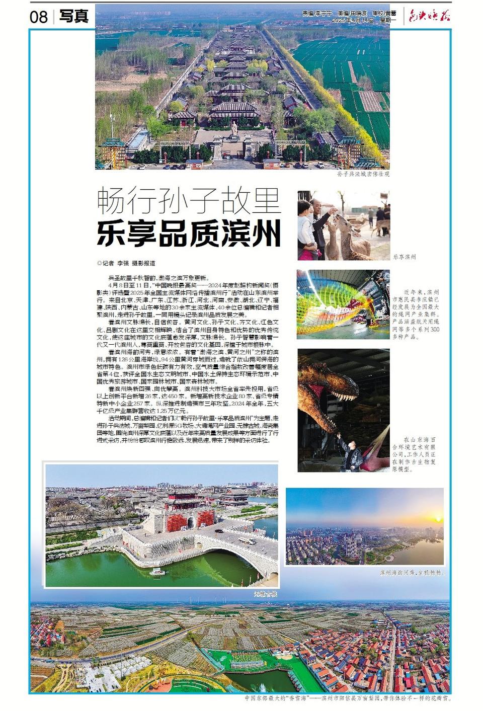 22家主流媒体持续整版推出《渤海之滨万象新》《兵圣故里 万象更新》《孙子故里 古韵新辉》《兵圣故里焕新颜 品质滨州展魅力》《黄河岸边文脉长 渤海潮头产业兴》《领略滨州之美》等专题专版,聚焦滨州生态环境、产业升级、文化赋能,版式新颖,内容丰富。