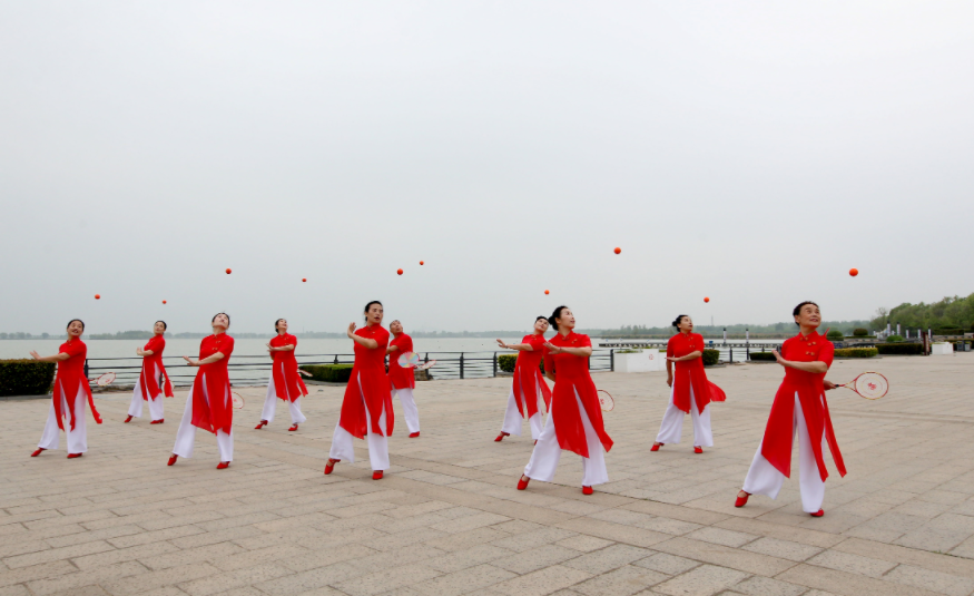 太白湖畔的文体展演更是一场“视觉盛宴”。六艺太极拳展演中,20名队员身着汉服,将“礼、乐、射、御、书、数”六艺融入拳法,一招一式尽显儒家文化的厚重底蕴;健身腰鼓队则以红绸为笔,将传统鼓点与现代街舞节奏完美融合,鼓槌翻飞间,仿佛听到了黄河号子在齐鲁大地回响;柔力球自编套路展演中,银发舞者以球拍为桨,在碧波倒影中划出柔美弧线,宛如一幅动人的画卷;男子健身球操队队员以刚劲有力的动作打破性别刻板印象,将健身球与武术、街舞元素巧妙融合,引得摄影学员们纷纷按下快门,记录下这精彩的瞬间。