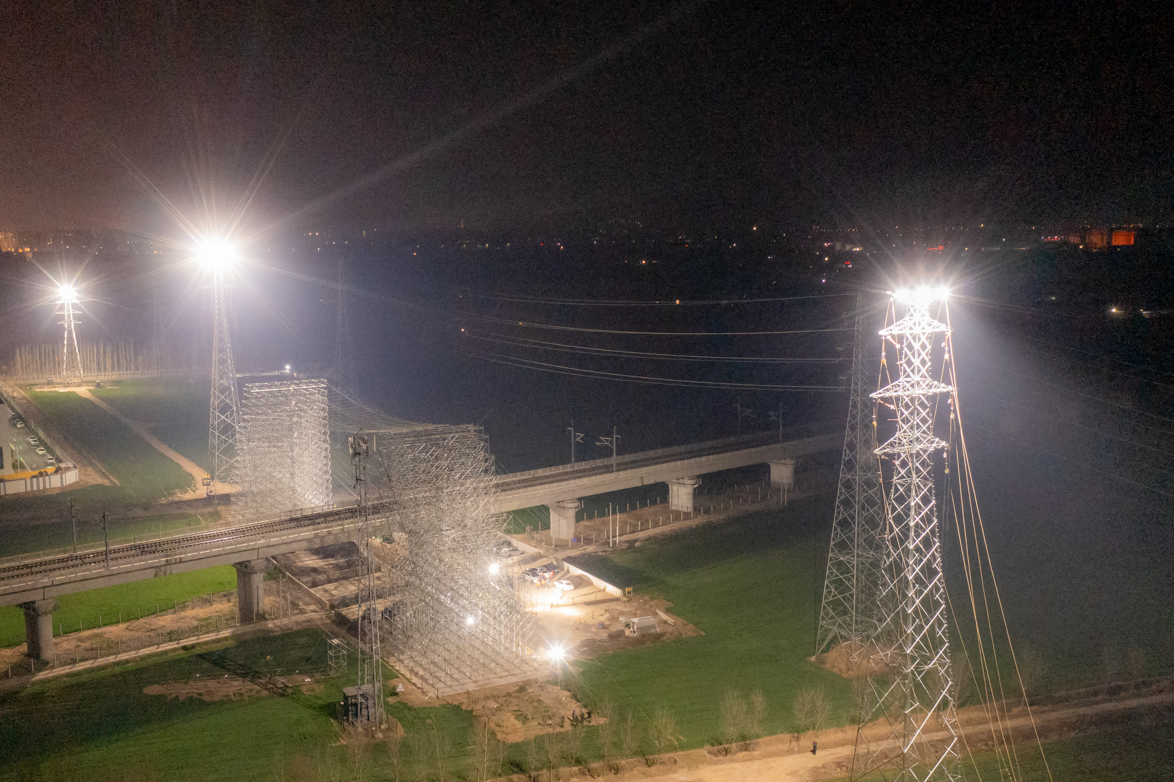 “注意张力!保持牵引速度!”在跨越鲁南高铁的施工现场,项目经理胡海昌的对讲机里不断传来指令。这是工程中最具挑战性的高风险作业——在有限的天窗期内,施工团队采用无人机牵引、可视化牵张设备等先进技术,经过8个凌晨的星夜鏖战,实现了"零误差"跨越。