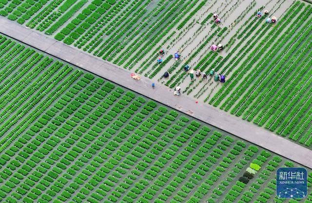 ↑ 6月8日,在江苏里下河地区农科所(扬州市农科院),农民在田里起水稻秧苗(无人机照片)。新华社发(孟德龙摄)