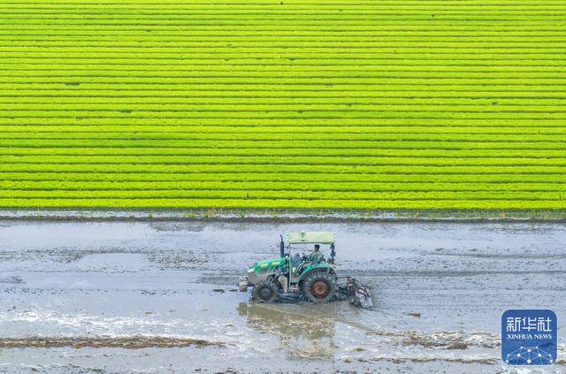 ↑ 6月9日,在江苏省兴化市陈堡镇蒋庄村,农民驾驶农机在田间耕作,准备夏种(无人机照片)。新华社发(周社根摄)