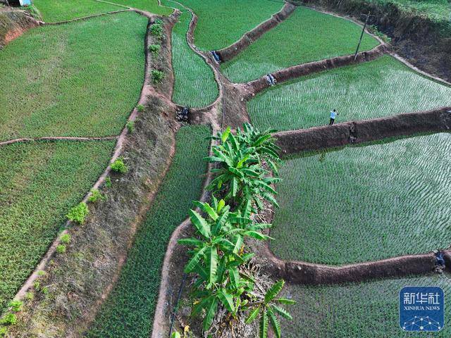 ↑ 6月8日,在云南省景洪市基诺山基诺族乡司土村,农民在田间查看水稻长势(无人机照片)。新华社发(李云生摄)