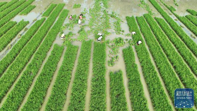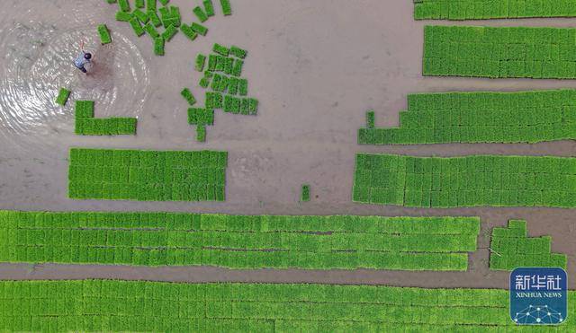 ↑ 6月8日,在江苏省泗洪县石集乡汴水社区,农民在秧田间起秧苗(无人机照片)。新华社发(许昌亮摄)
