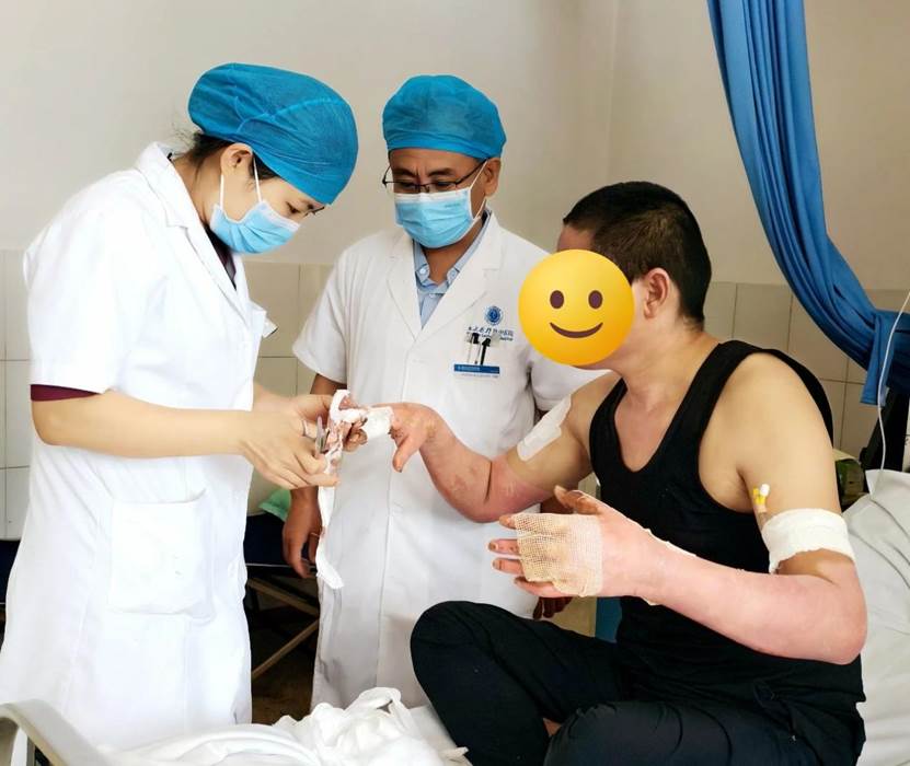 次日下午,患者顺利抵达,王春雷带领团队迅速开展诊疗:精准评估烧伤面积、制定补液抗休克方案、实施无痛清创术……经过精心的治疗与守护,患者生命体征逐渐平稳,面部肿胀明显减轻。