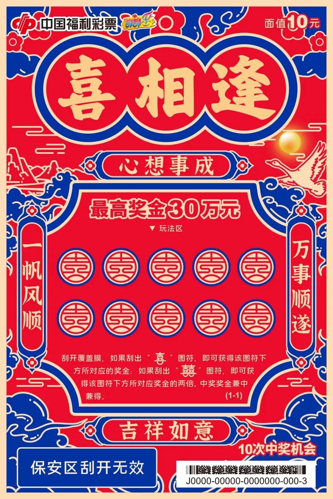 相逢皆欢喜,欢乐喜相逢。“喜相逢”是刮刮乐的经典票种之一,票如其名,吉祥喜庆、寓意美好。该系列彩票共有10元、20元、30元、50元四个面值。